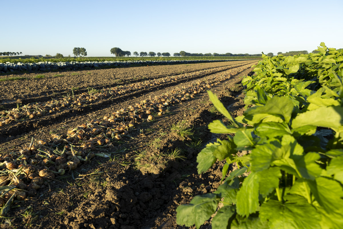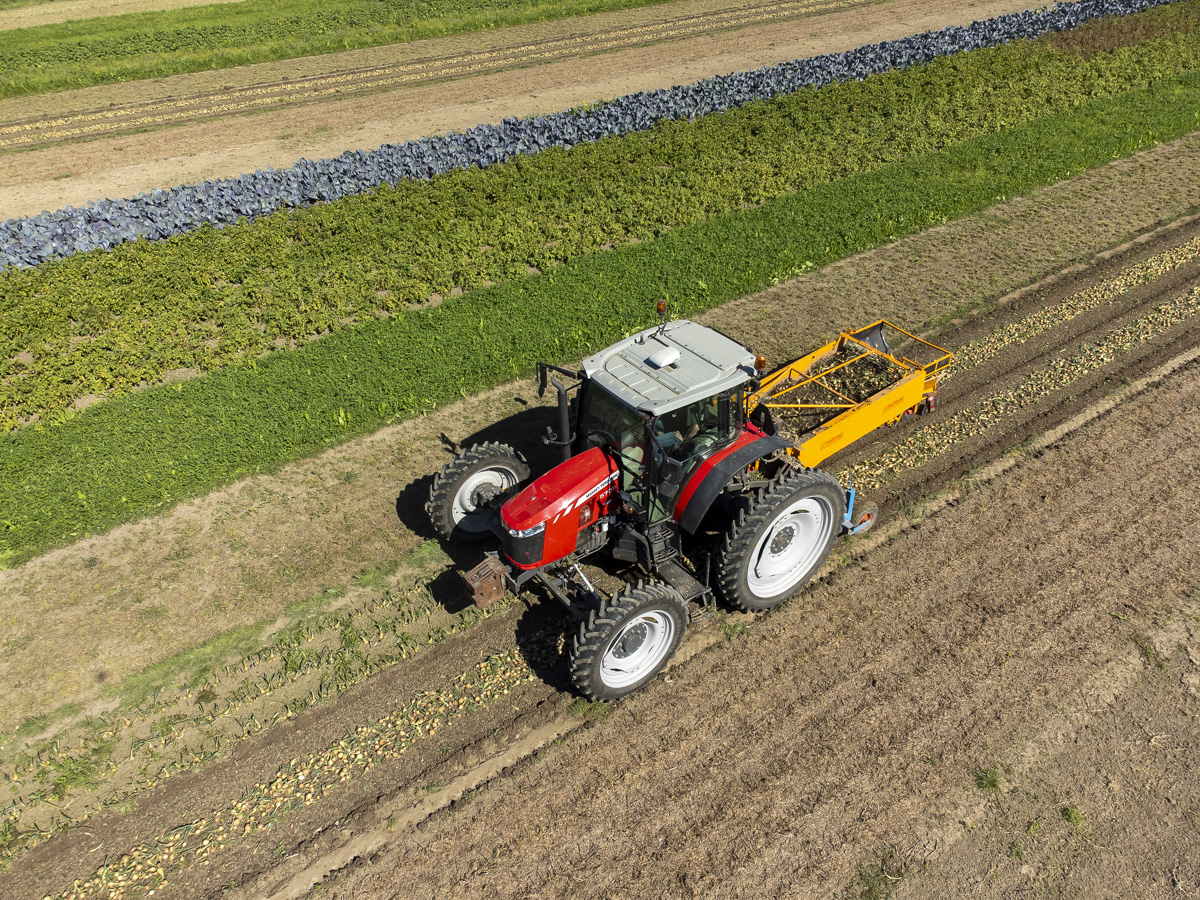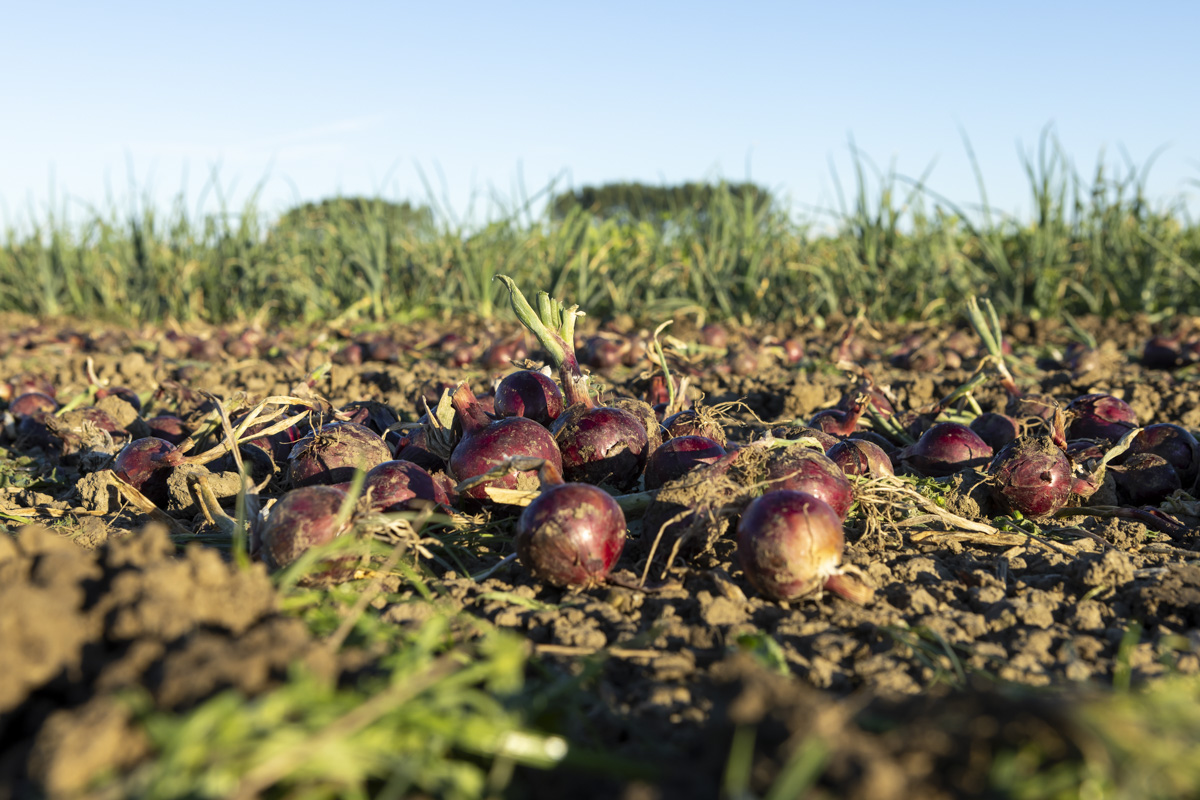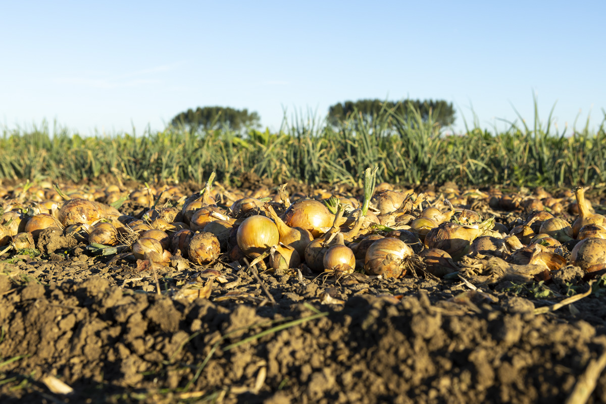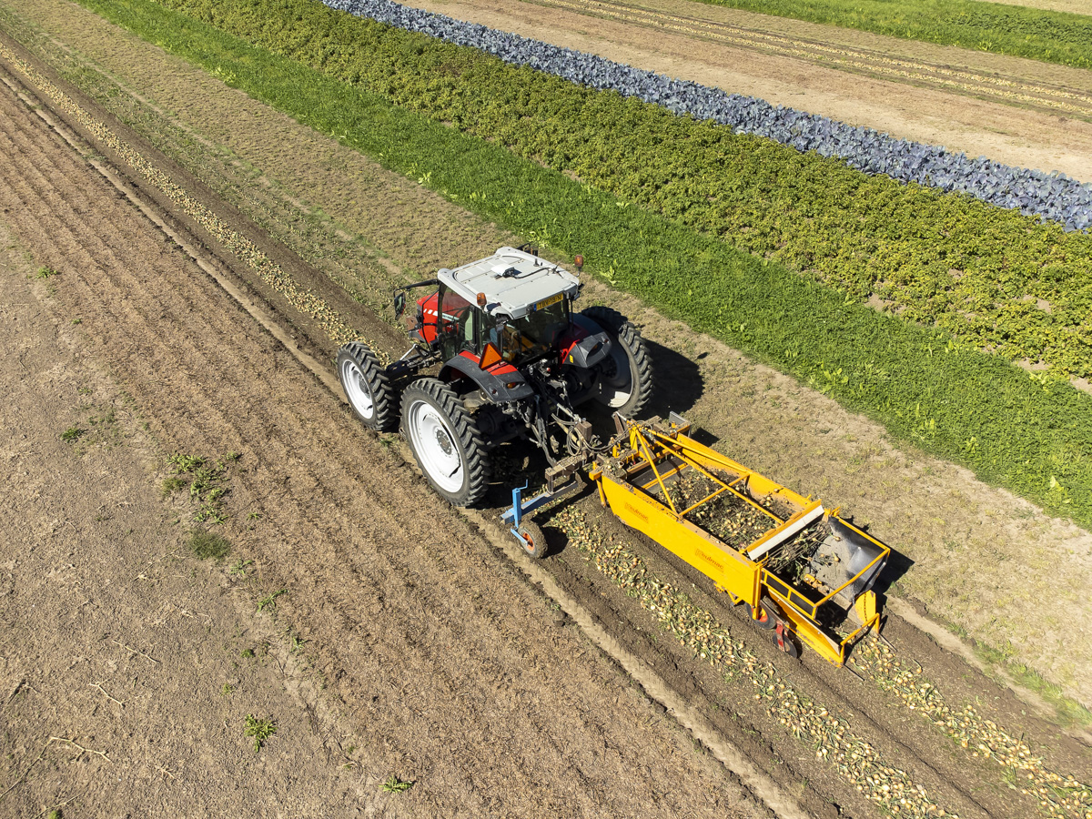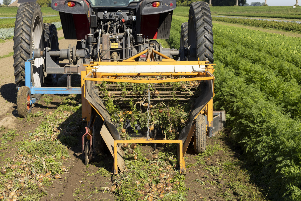 Foto’s van het rooien van de uien en diverse strokenteelten op de akkers van biologisch akkerbouwbedrijf BI-JOVIRA