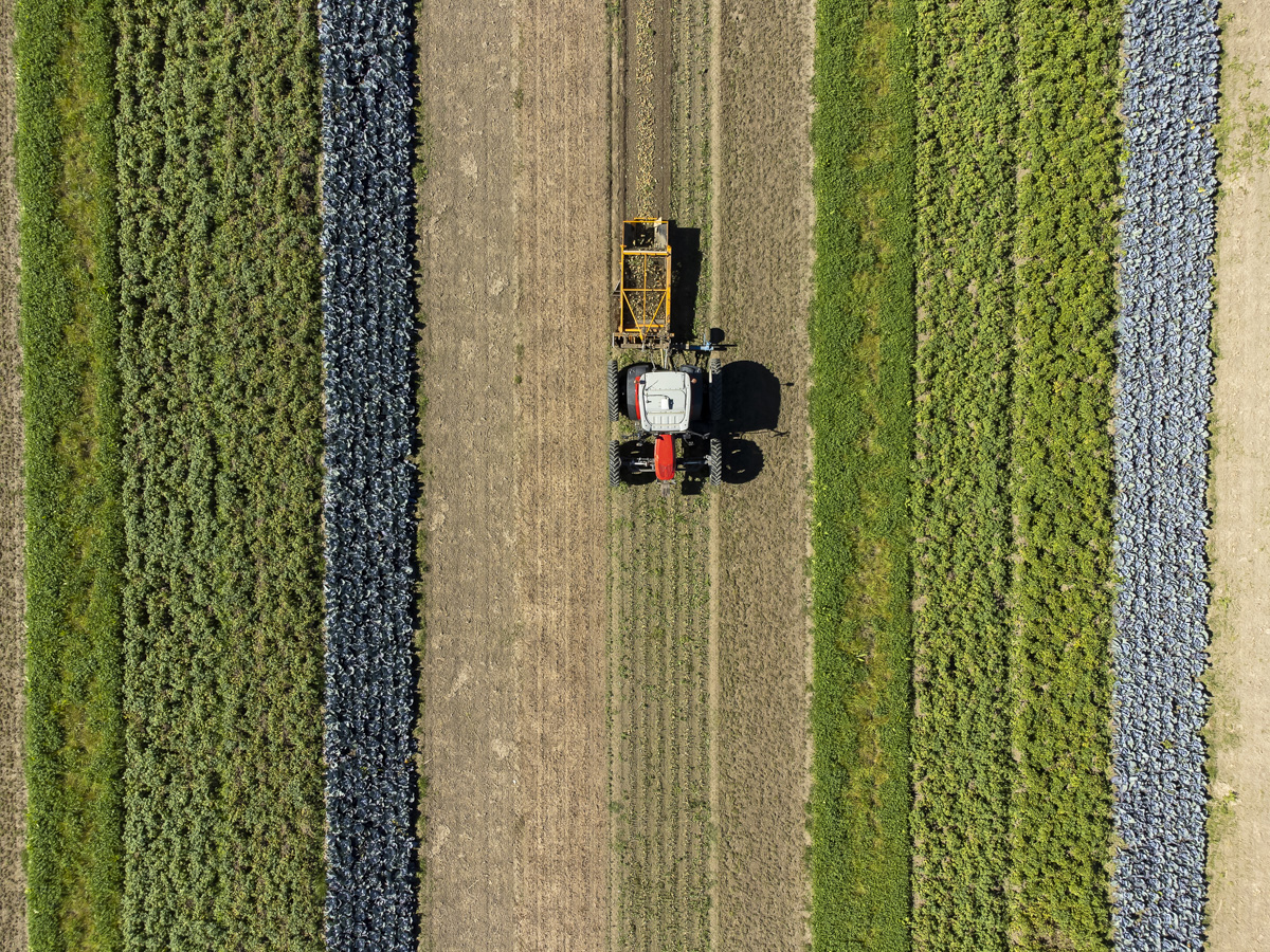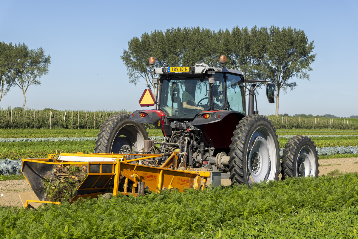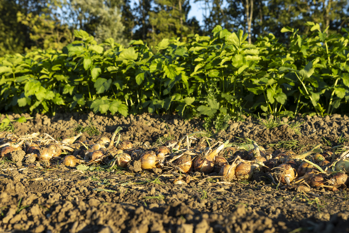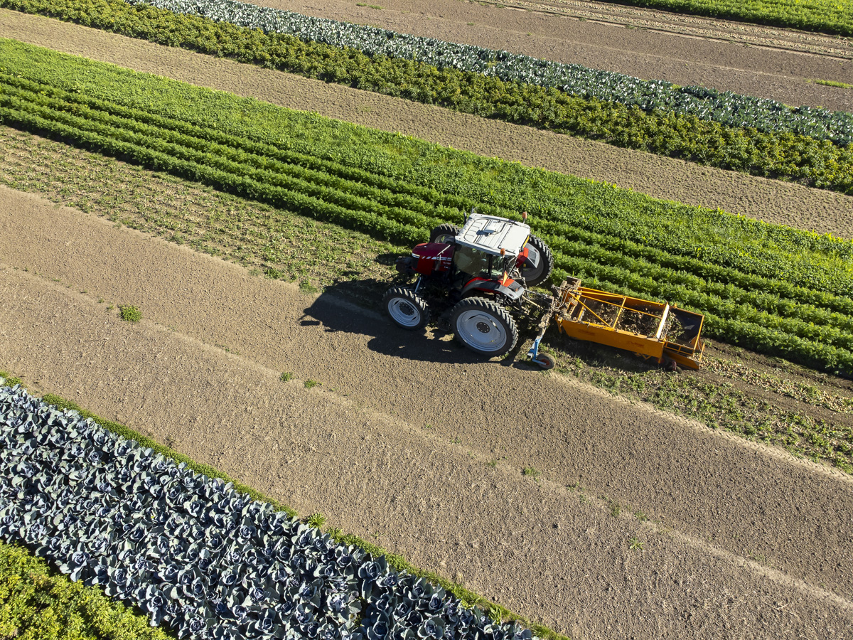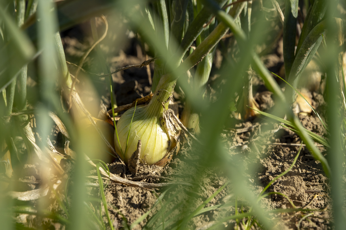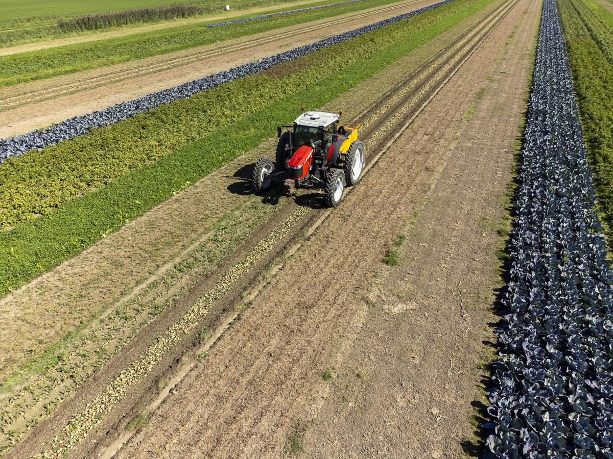 Foto’s van het rooien van de uien en diverse strokenteelten op de akkers van biologisch akkerbouwbedrijf BI-JOVIRA