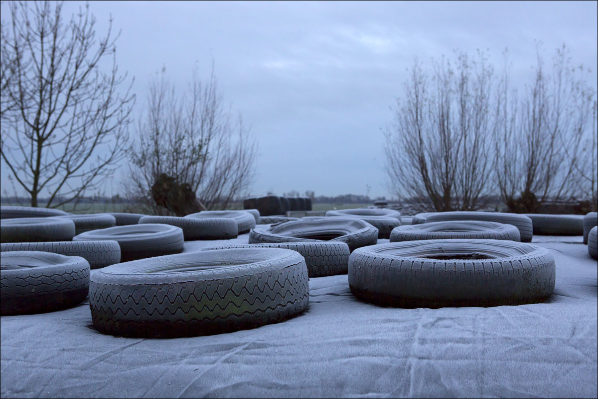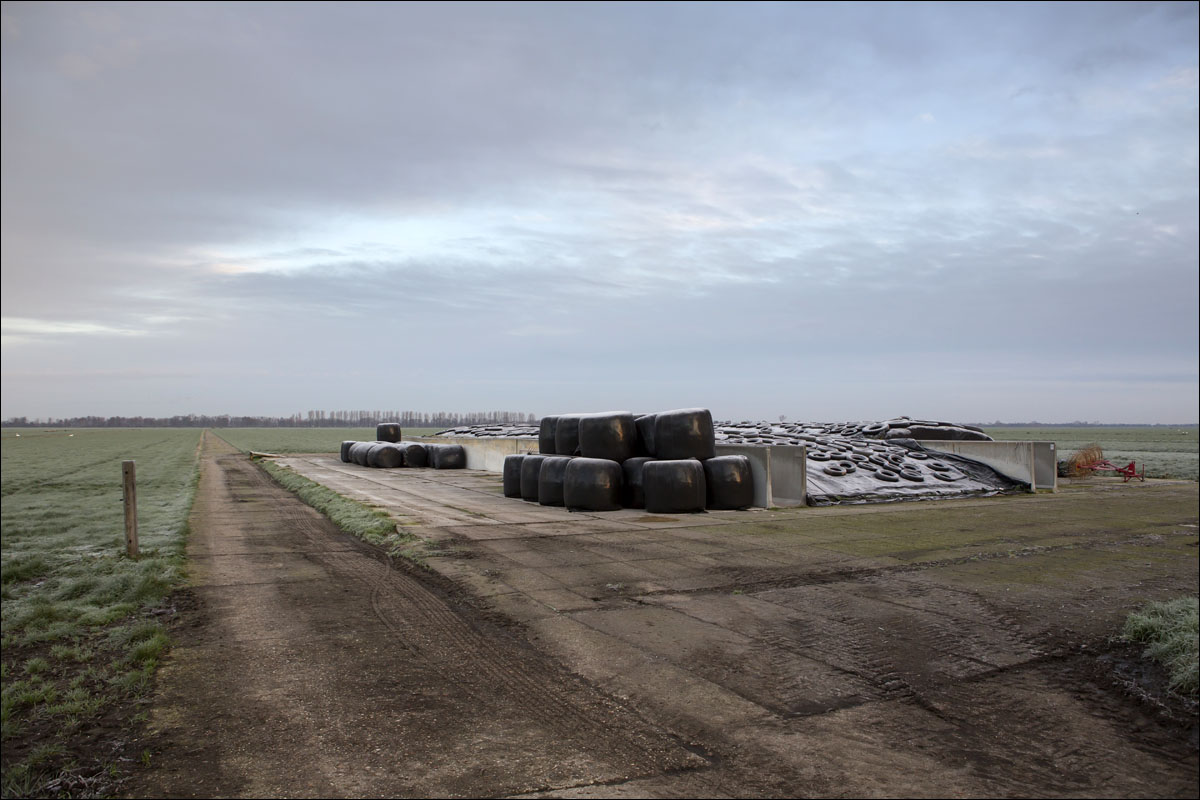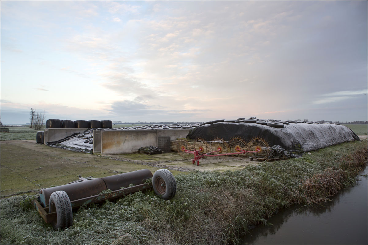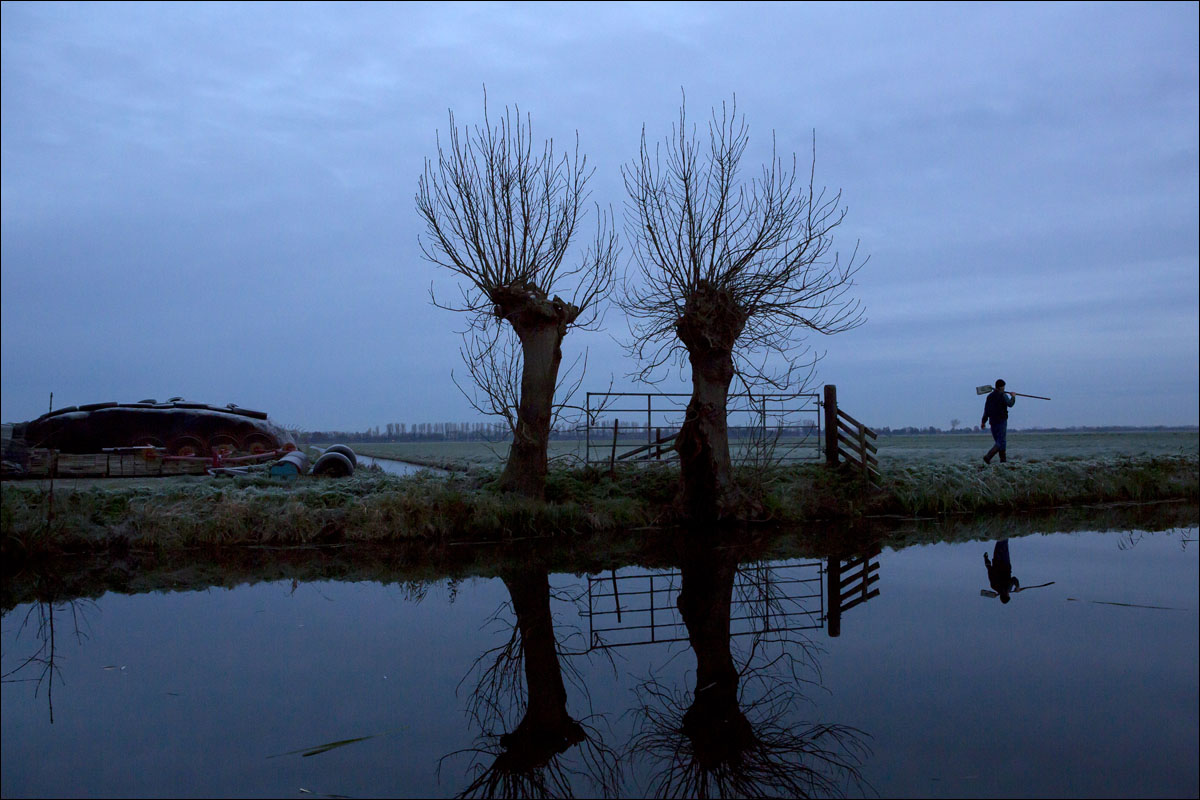 Foto’s van boer van Schie die vroeg op staat en aan het werk gaat, de ochtendrijp op de kuil en plas dras met zonnepaneel (de onderwaterzetting van een stuk grasland voor de weidevogels).