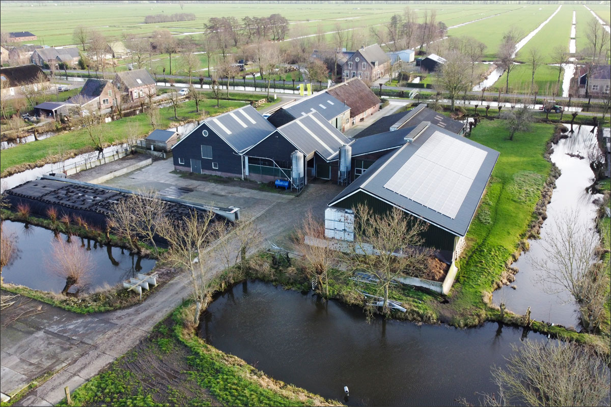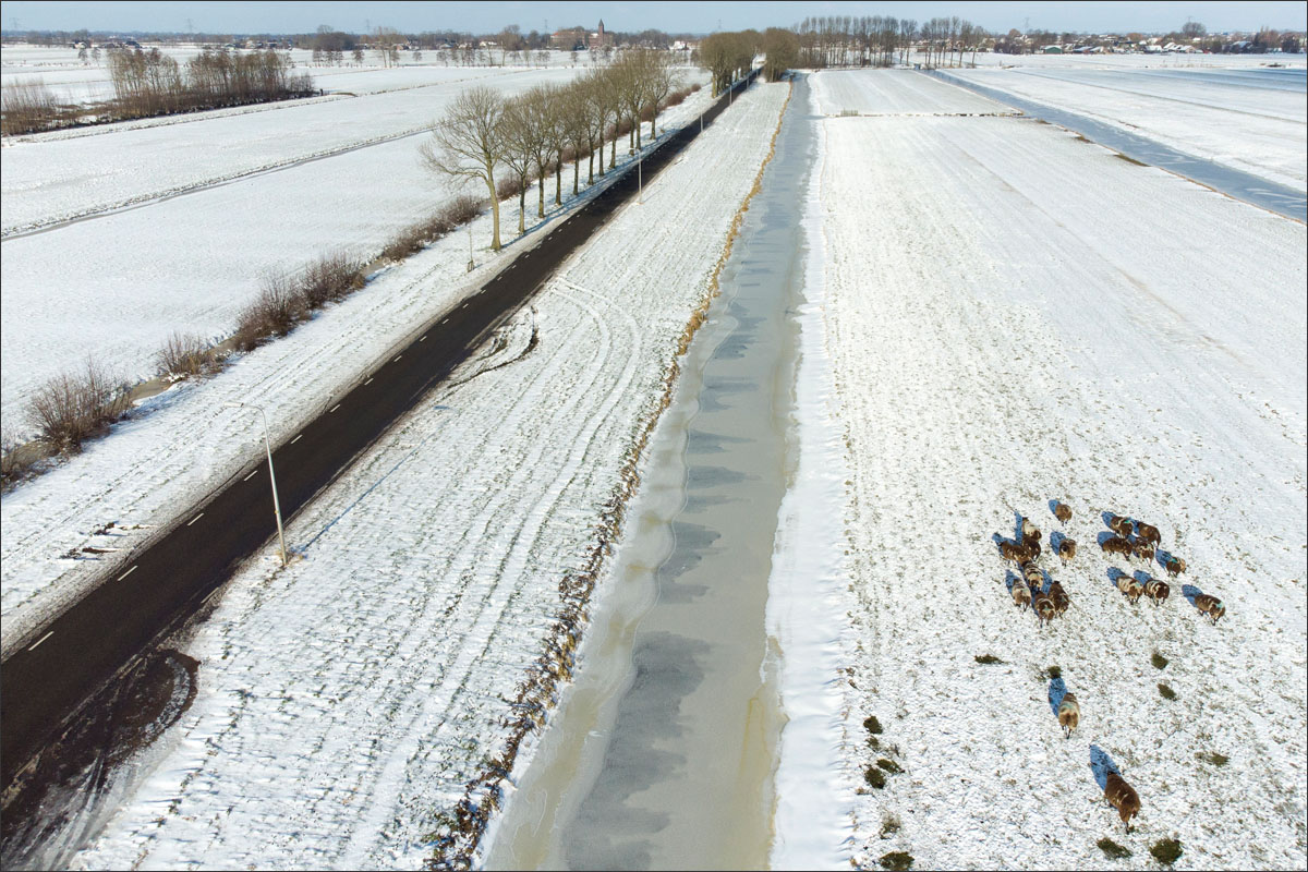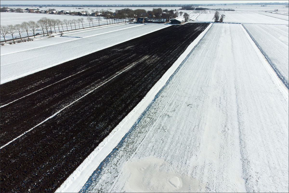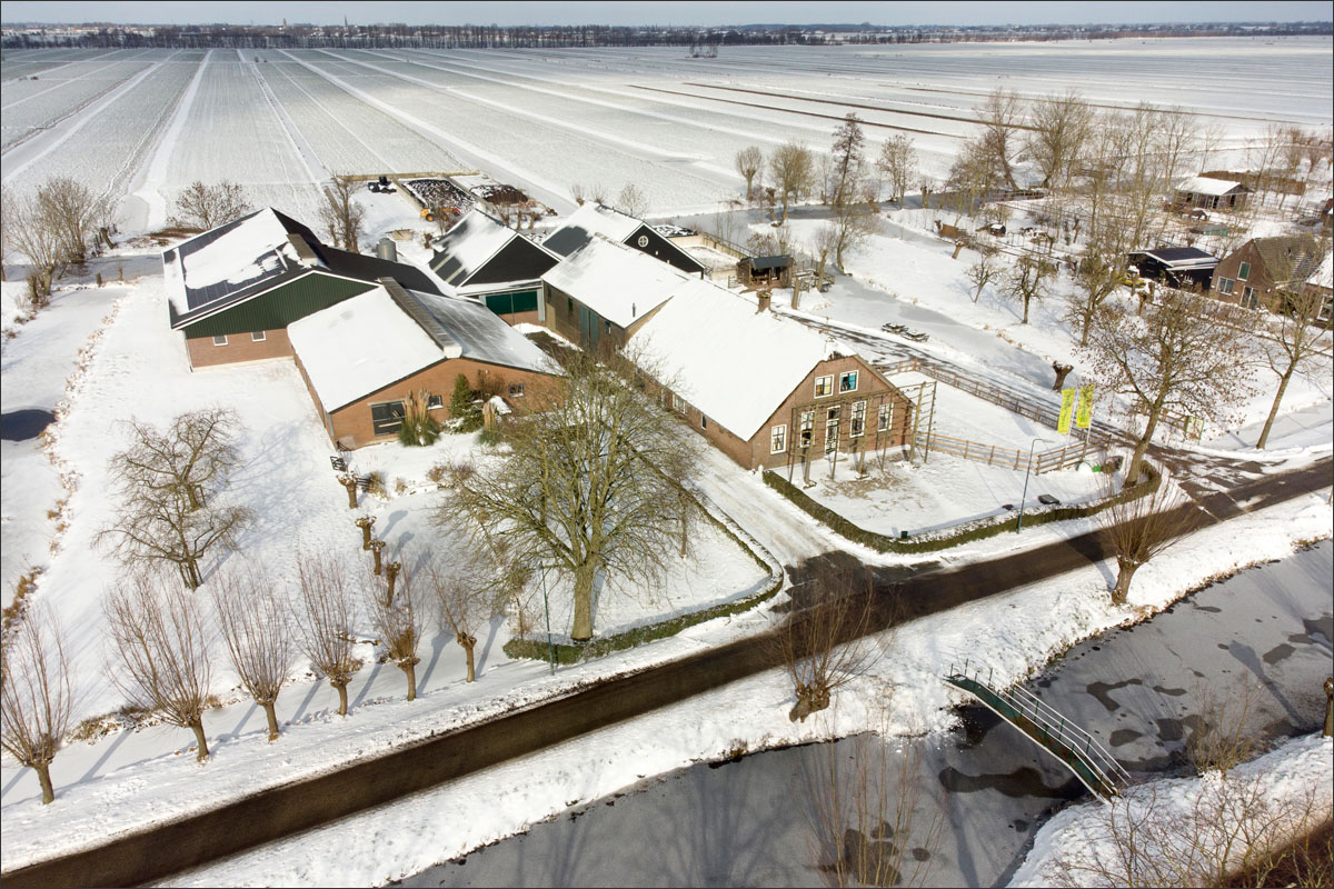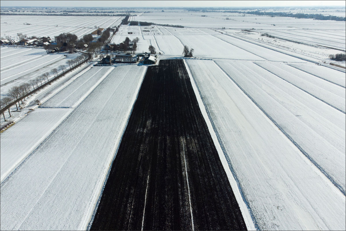 Dronefoto’s van het boerenleven, de boerderij en de groene- en besneeuwde polder.