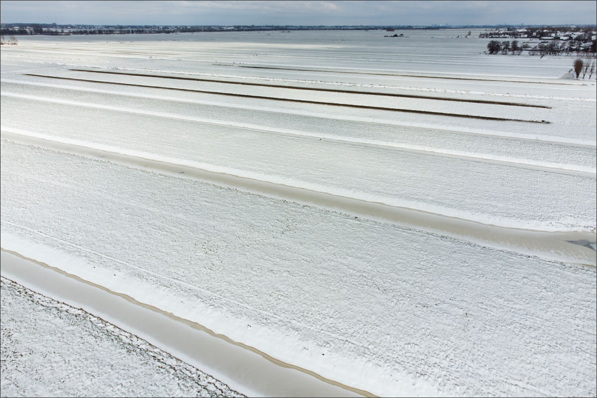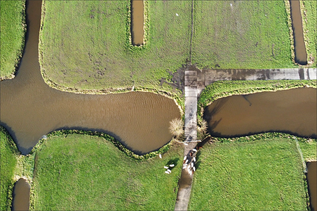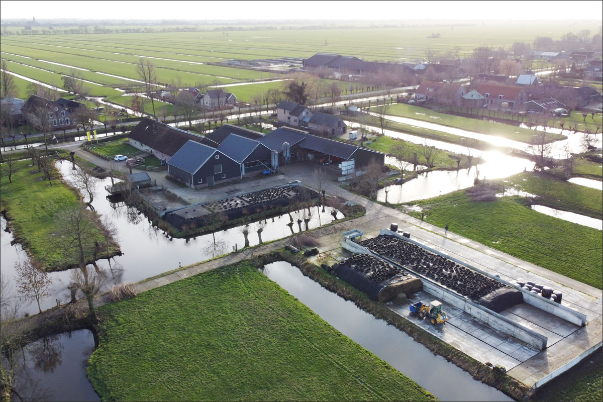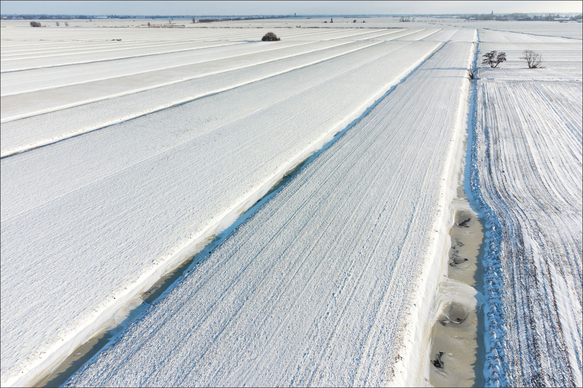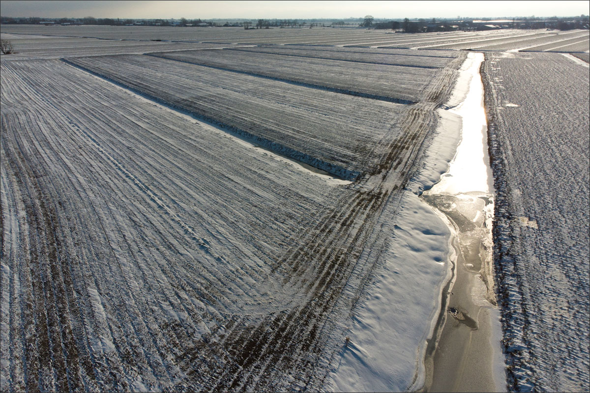 Dronefoto’s van het boerenleven, de boerderij en de groene- en besneeuwde polder.