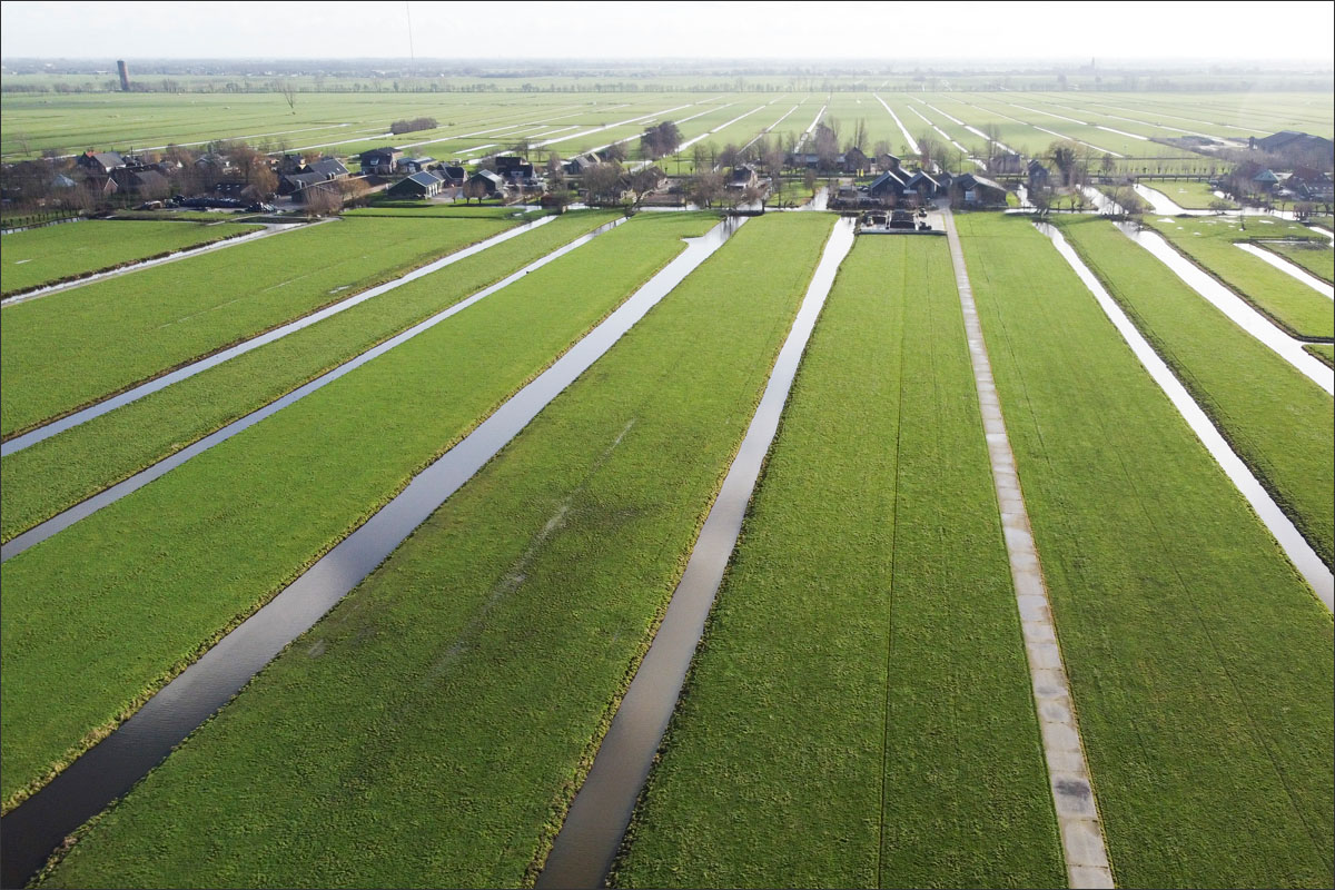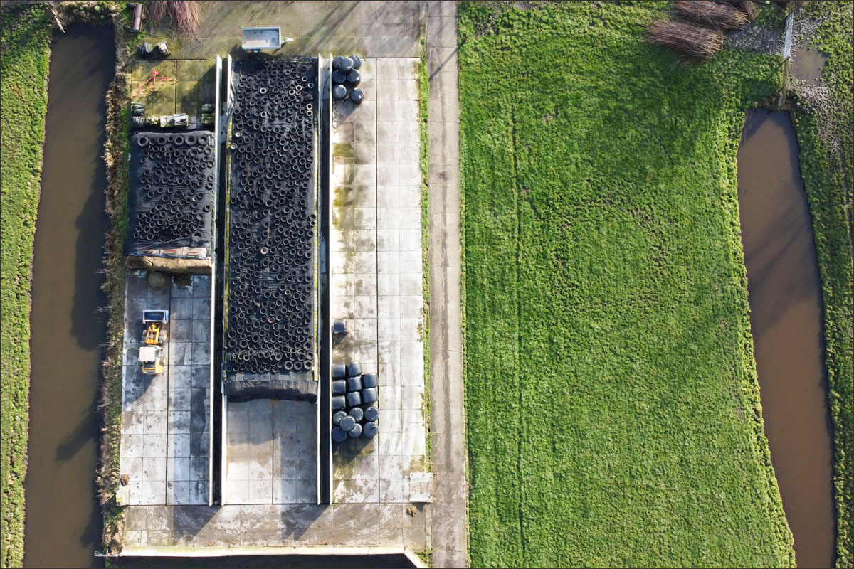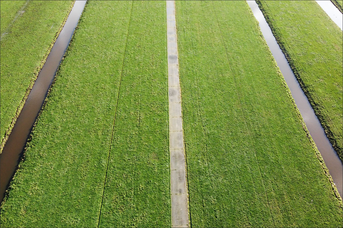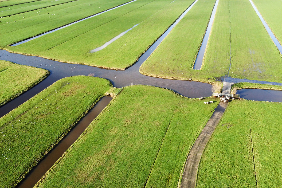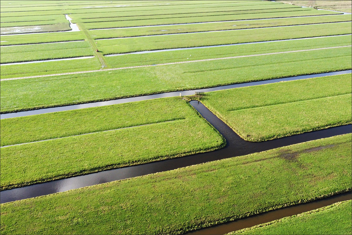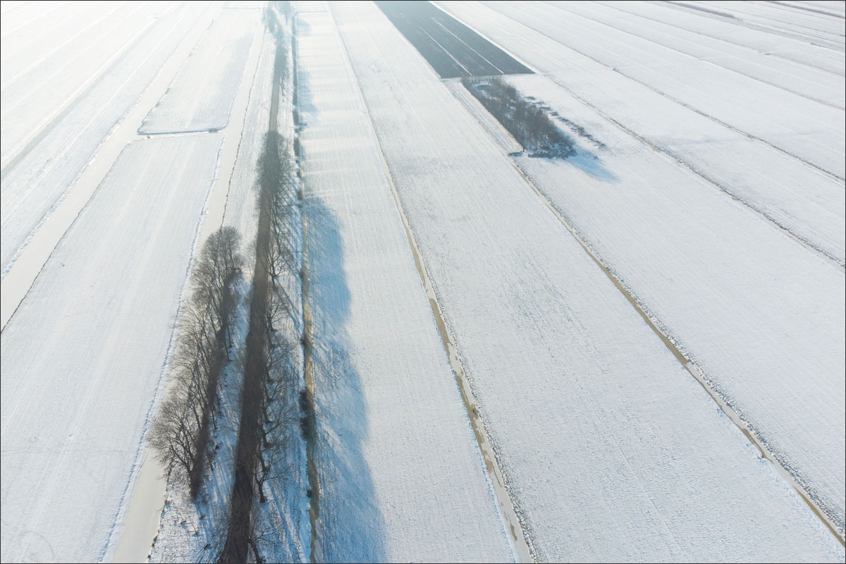 Dronefoto’s van het boerenleven, de boerderij en de groene- en besneeuwde polder.