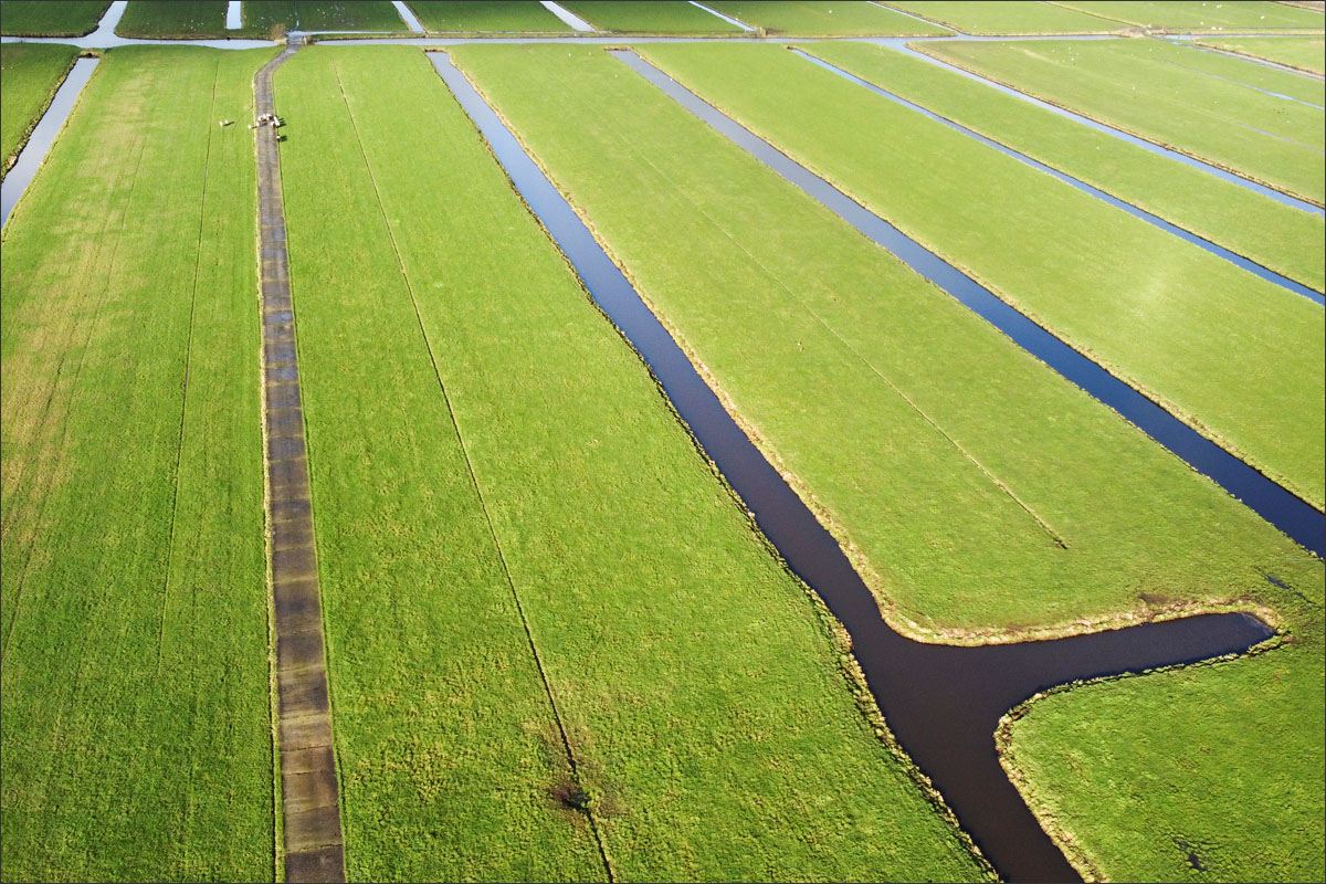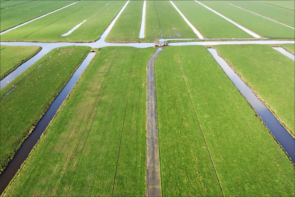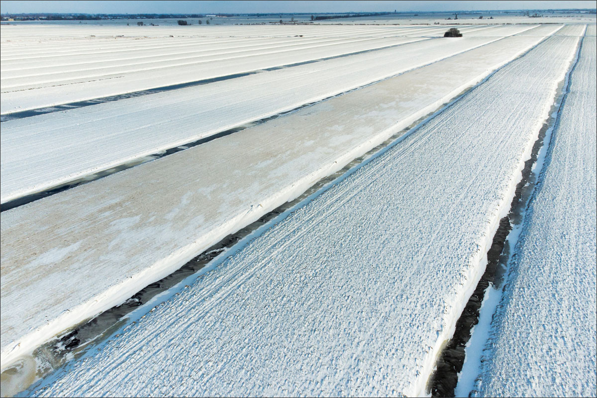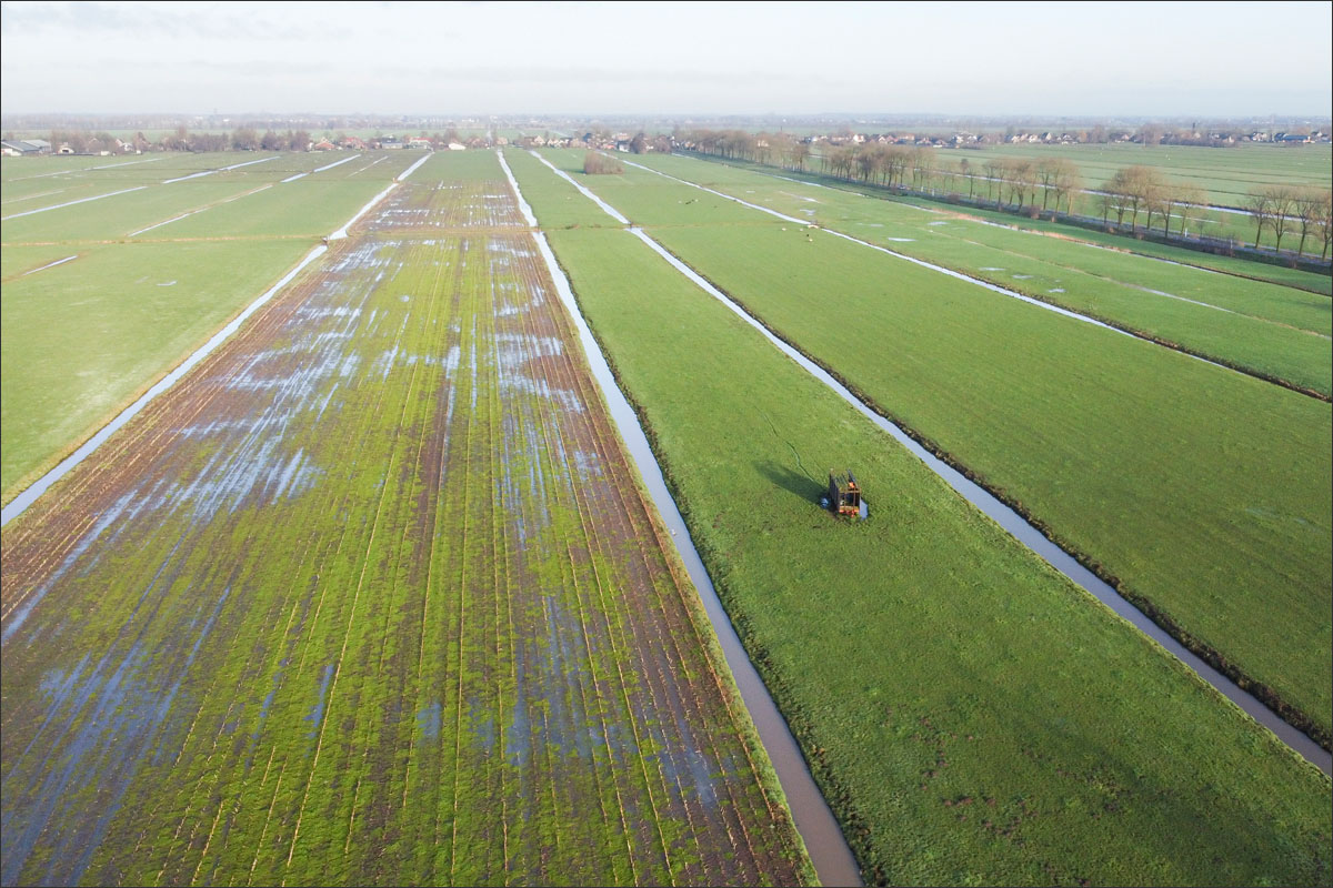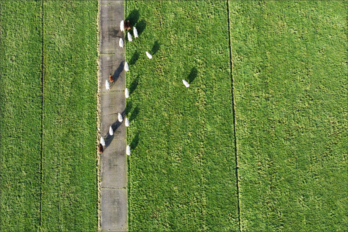 Dronefoto’s van het boerenleven, de boerderij en de groene- en besneeuwde polder.
