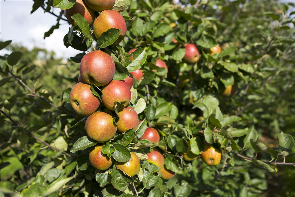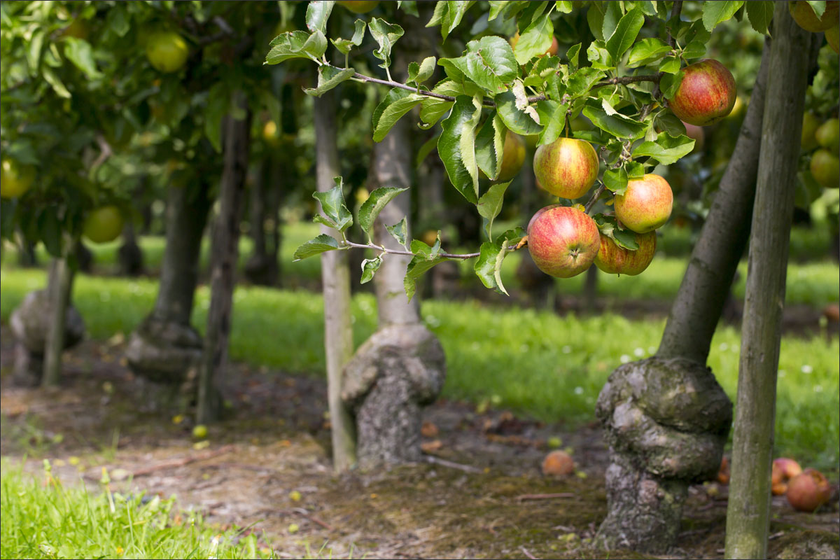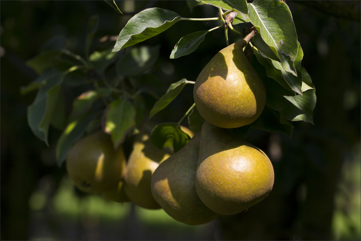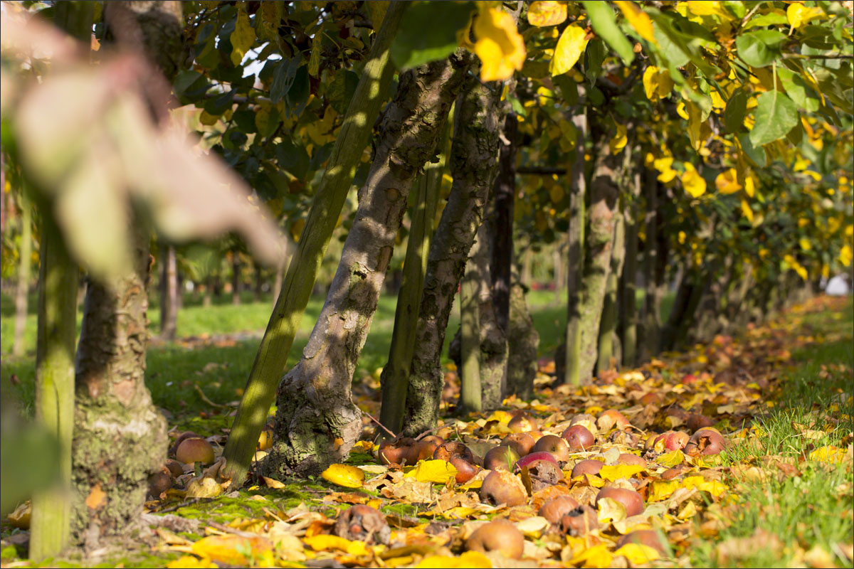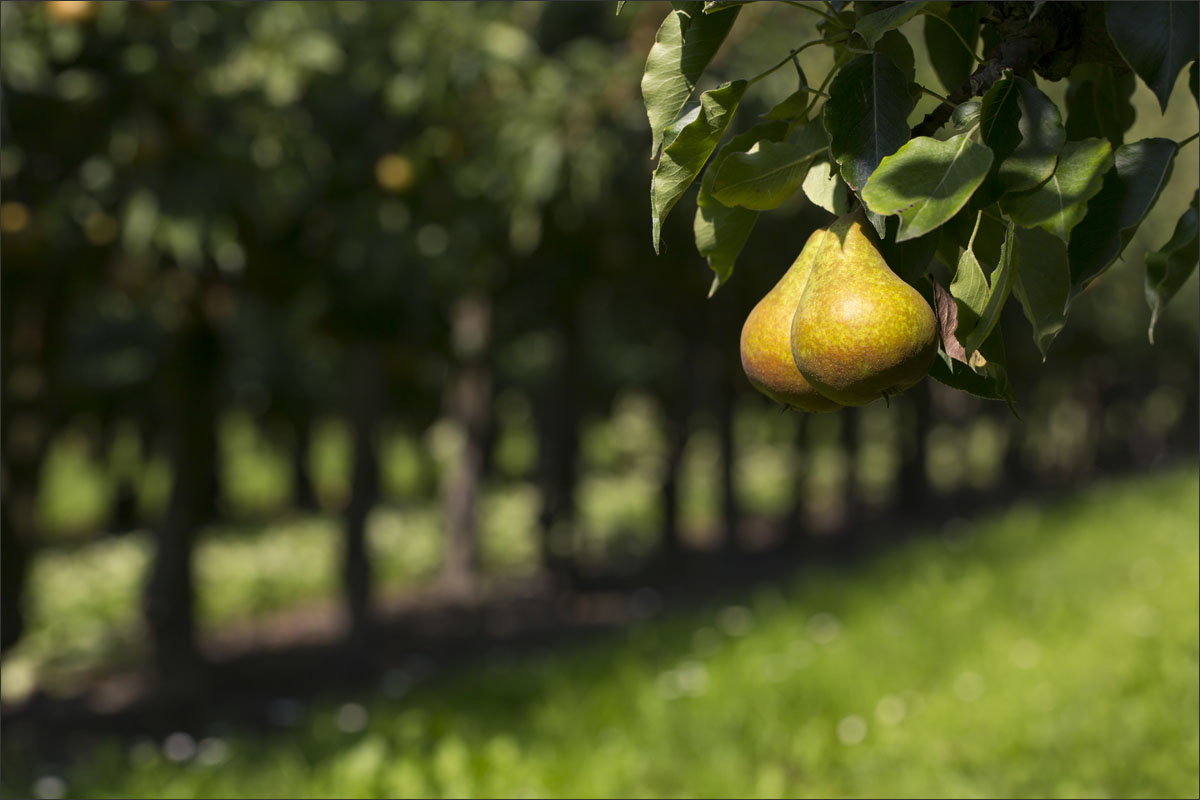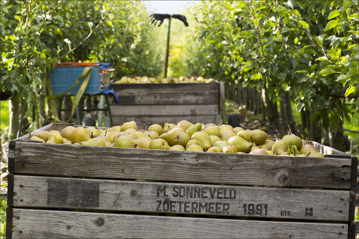 Foto’s van de appels en peren die aan de boom hangen, het plukken van de peren, de landwinkel en de herfstkleuren in de boomgaard.