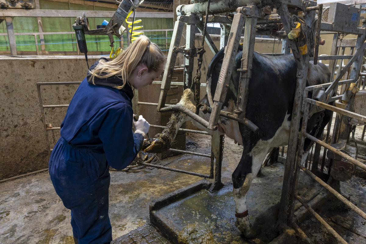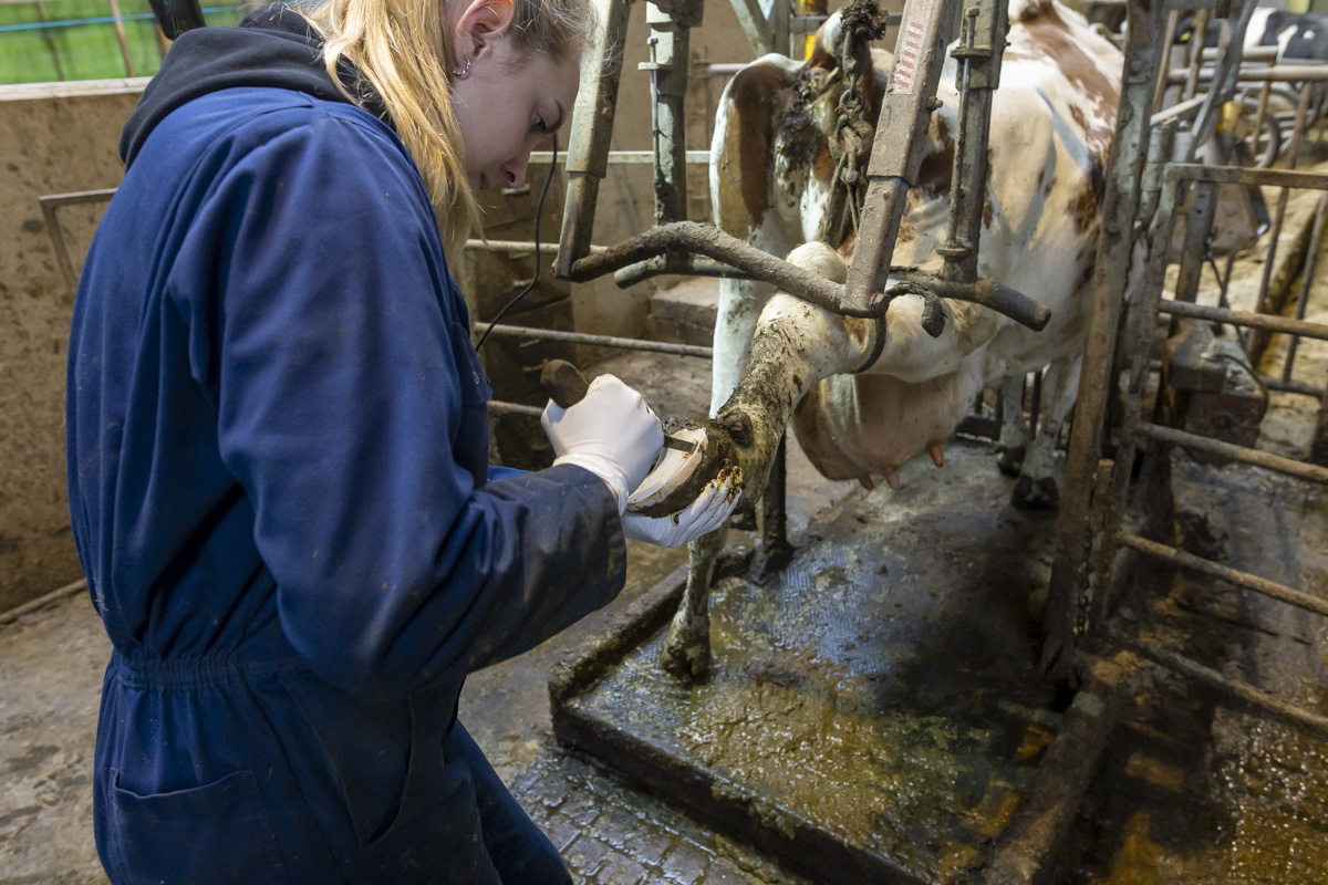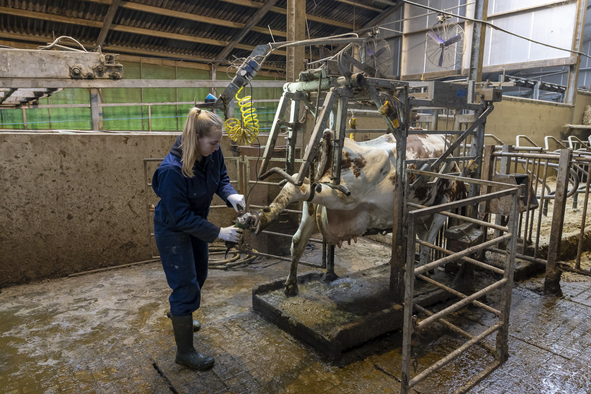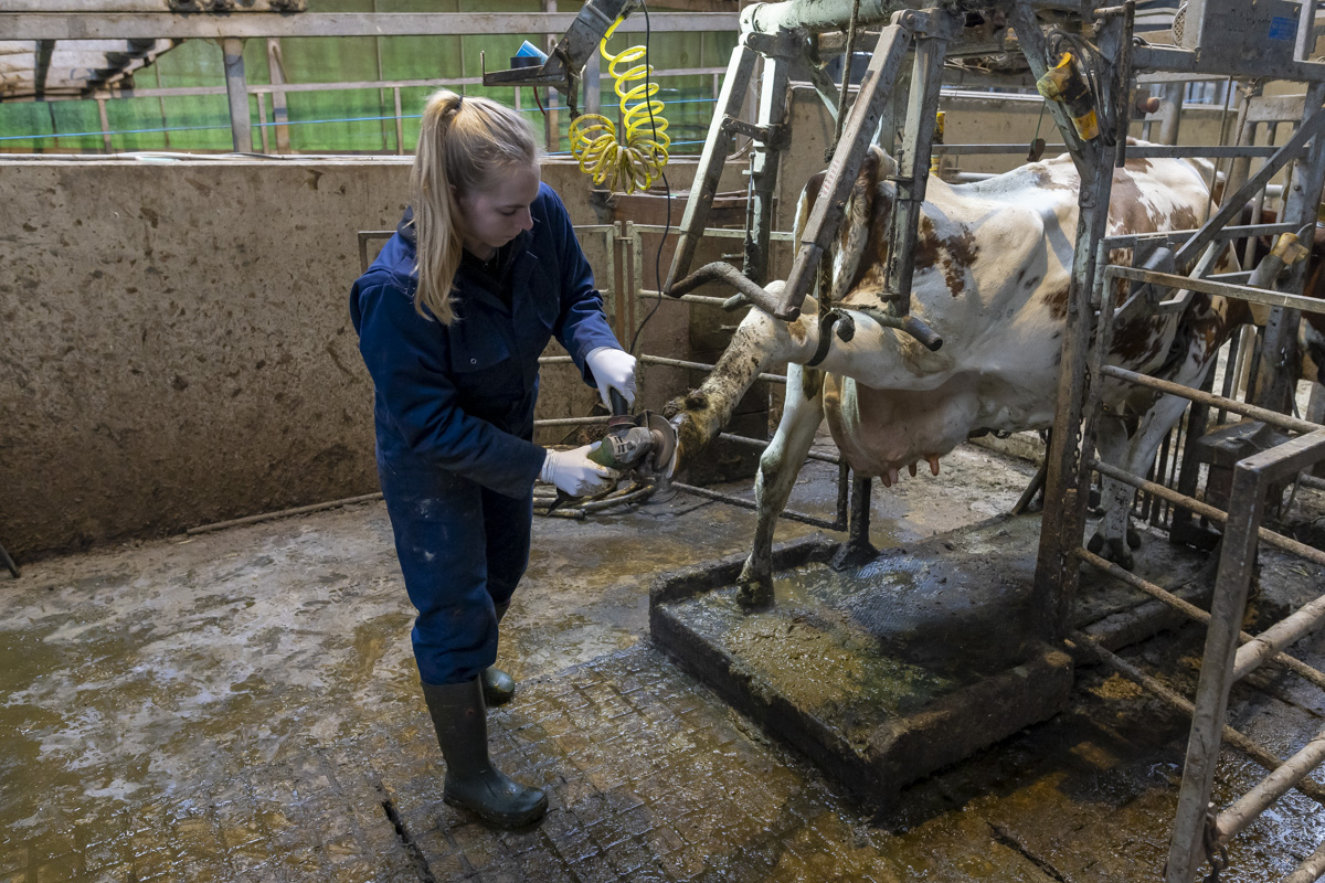 Een kijkje in de stal van de Twee Hoeven met o.a. het verzorgen van de hoeven van de koe (klauwbekappen), het aanschuiven van het ruwvoer en het verschonen van de ligboxen.