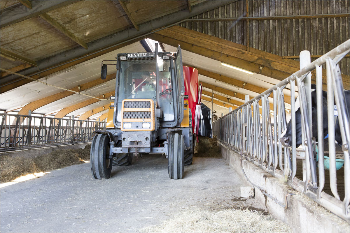 Foto’s van het laden, mengen en lossen van de voermengwagen voor het voeren van de koeien en de koeien die worden opgehaald om gemolken te worden.
