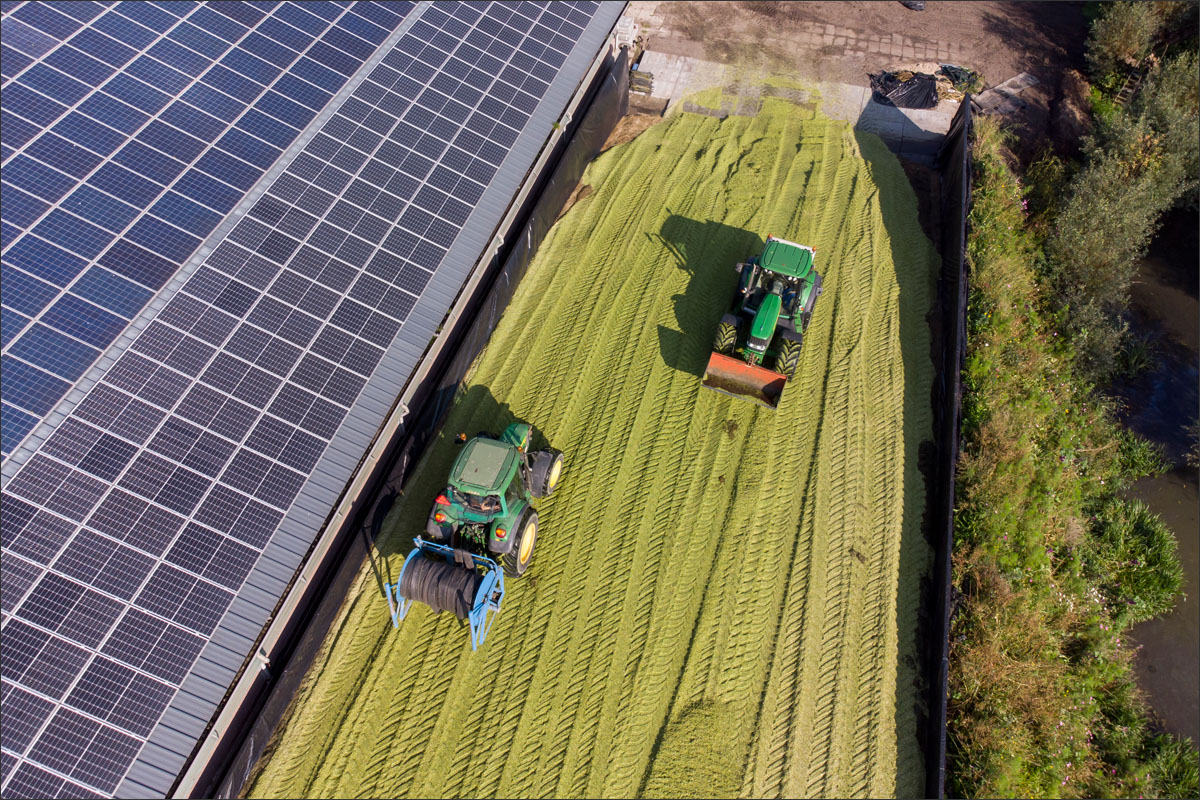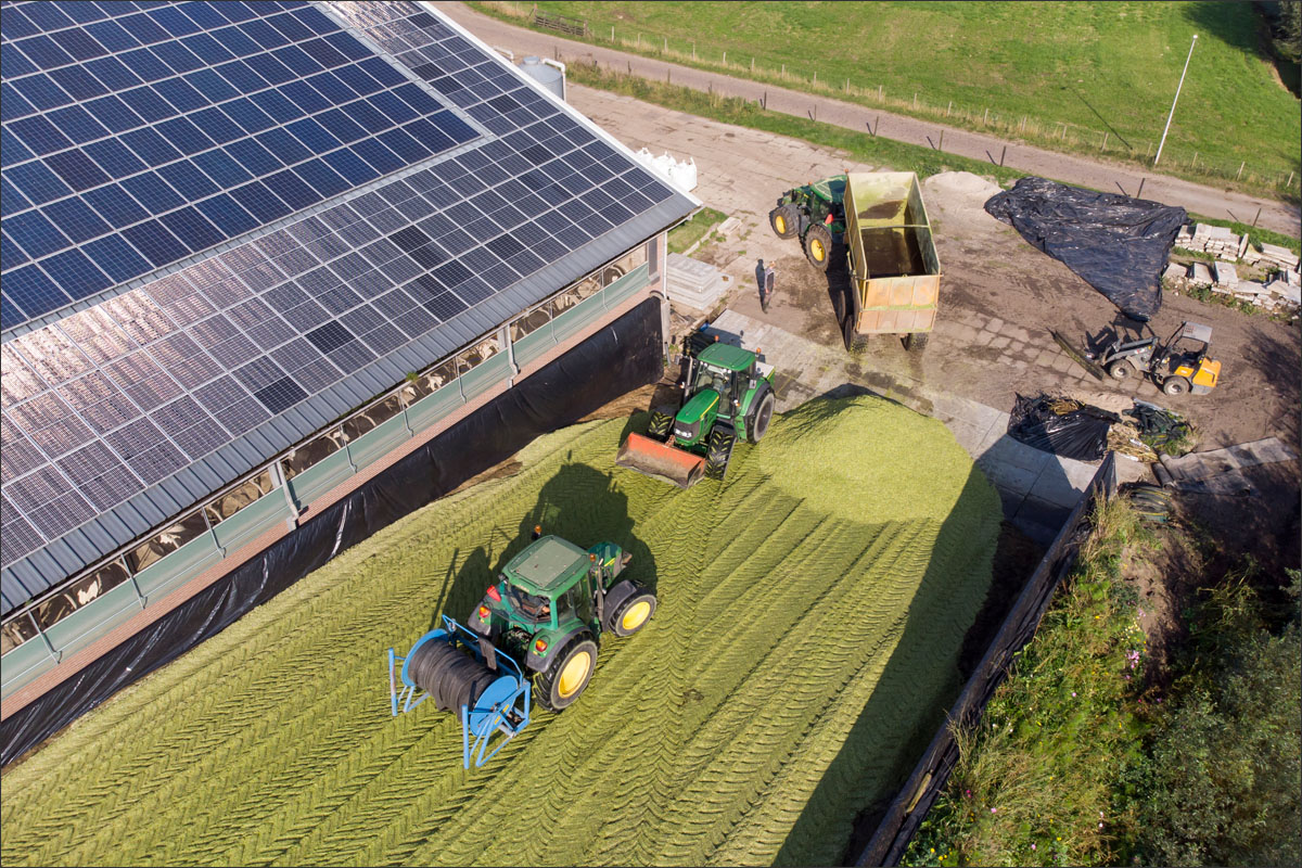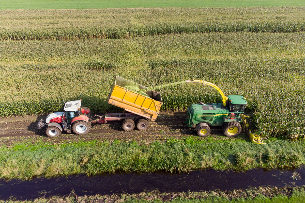 Luchtfoto’s van het maïs hakselen en inkuilen.