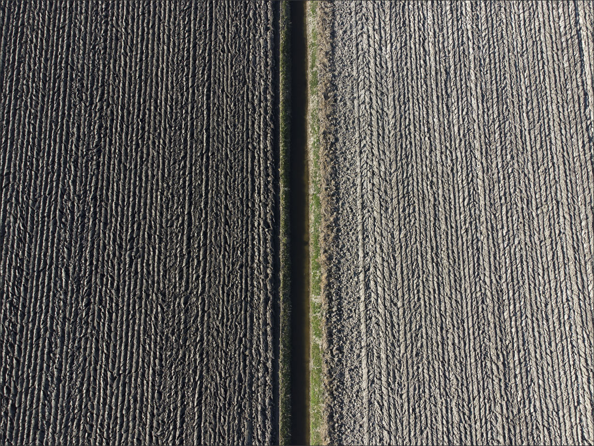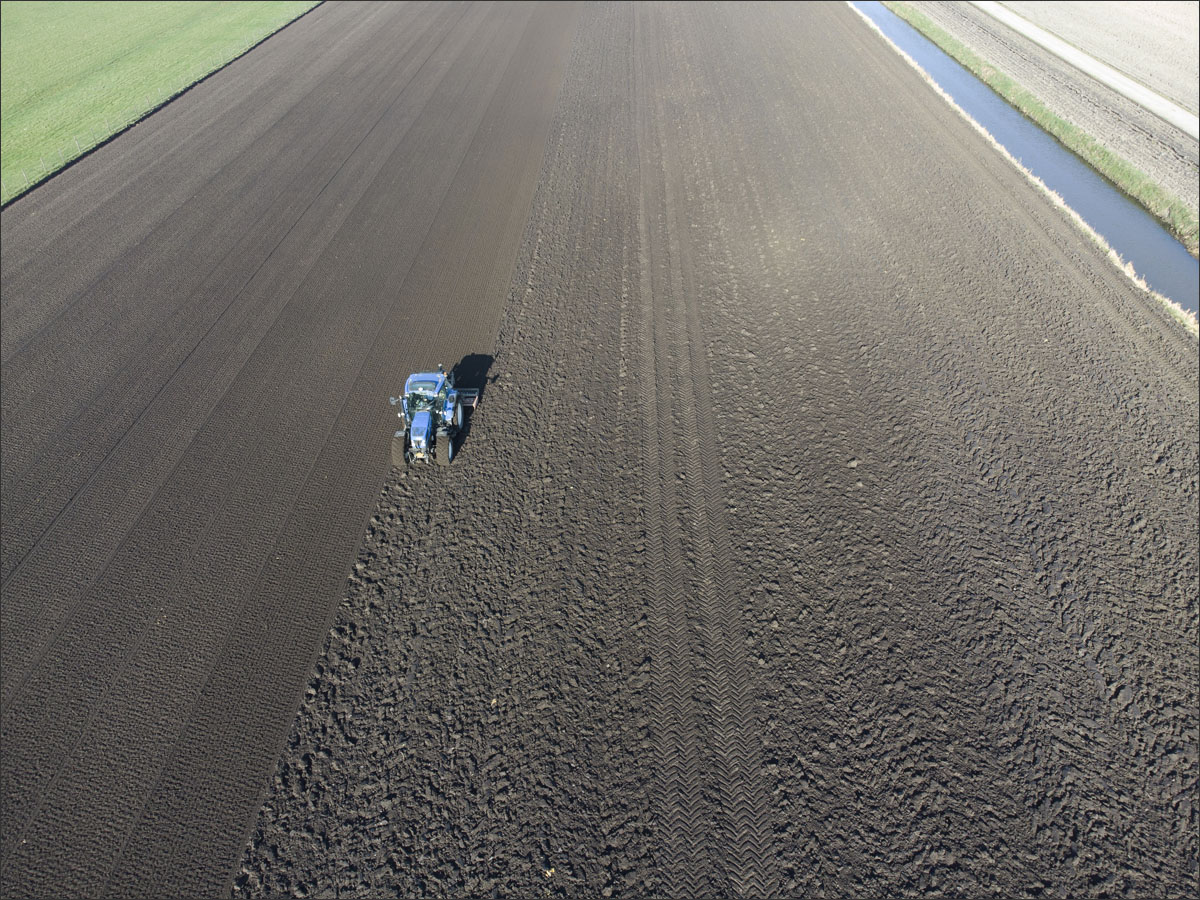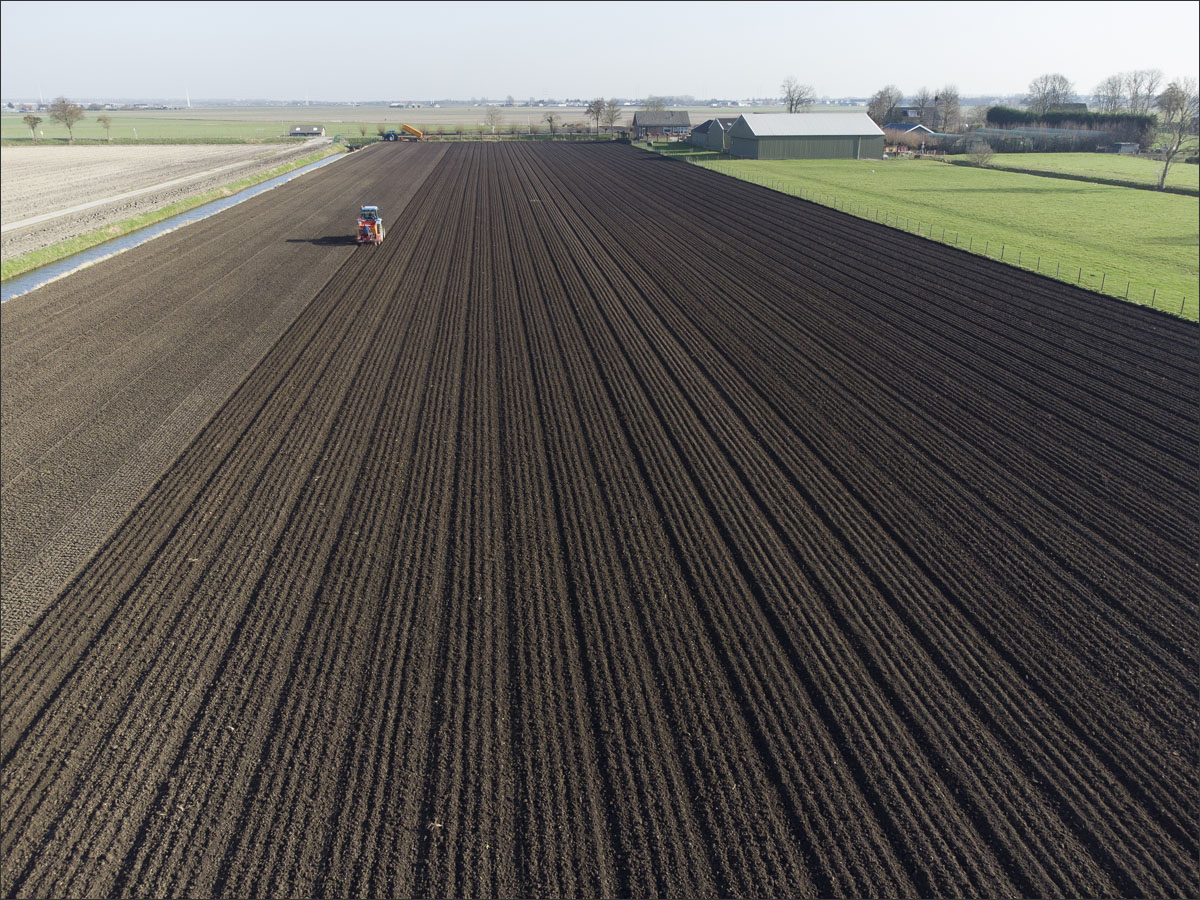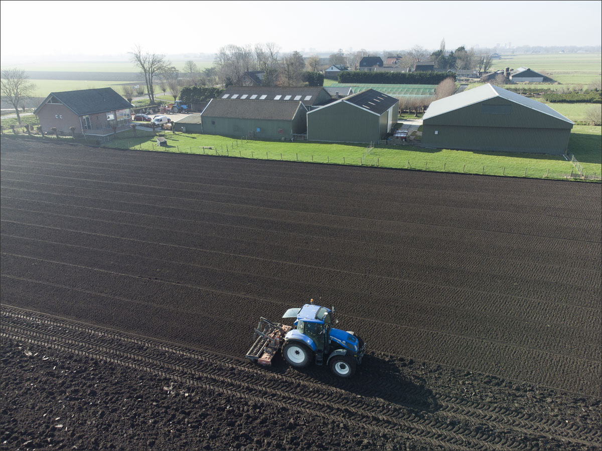 Luchtfoto’s van het roteren van de akker en het poten van de uien.