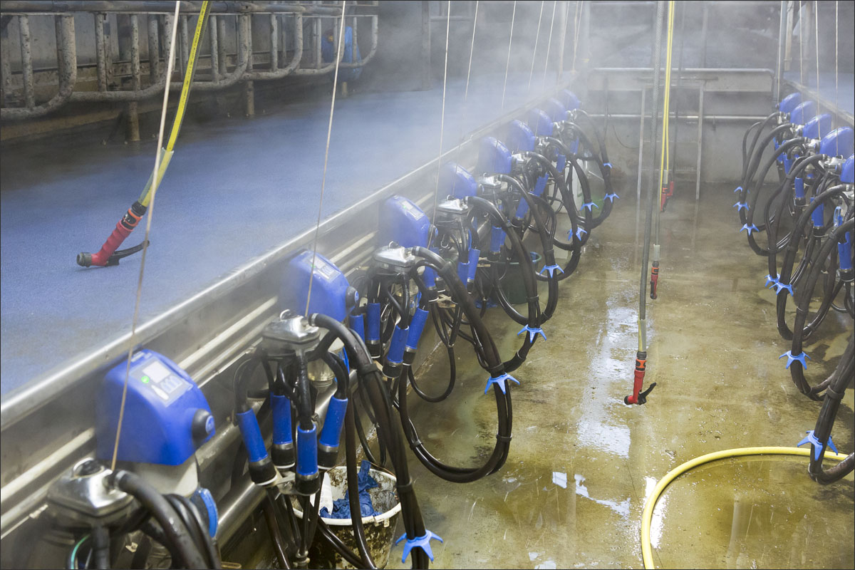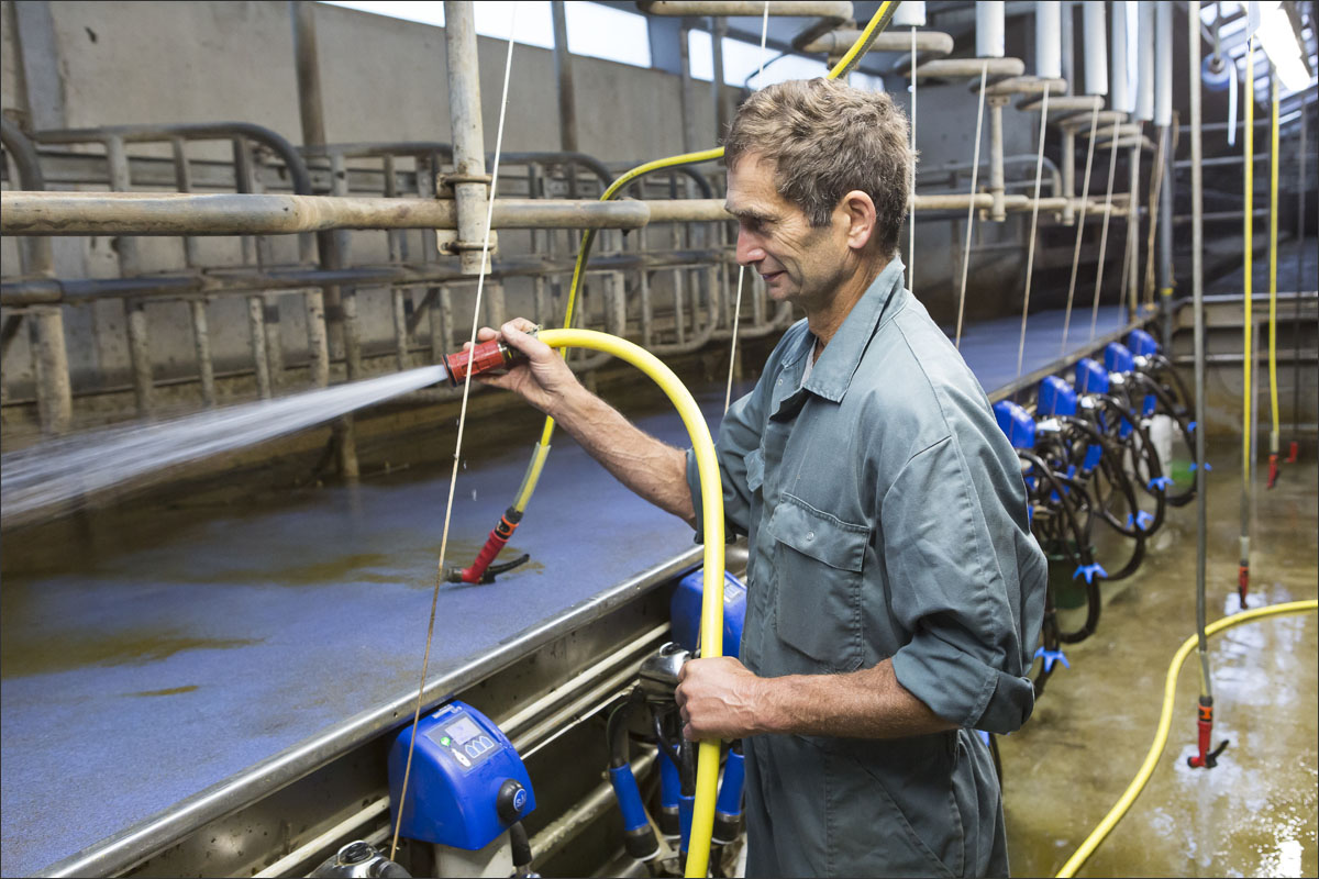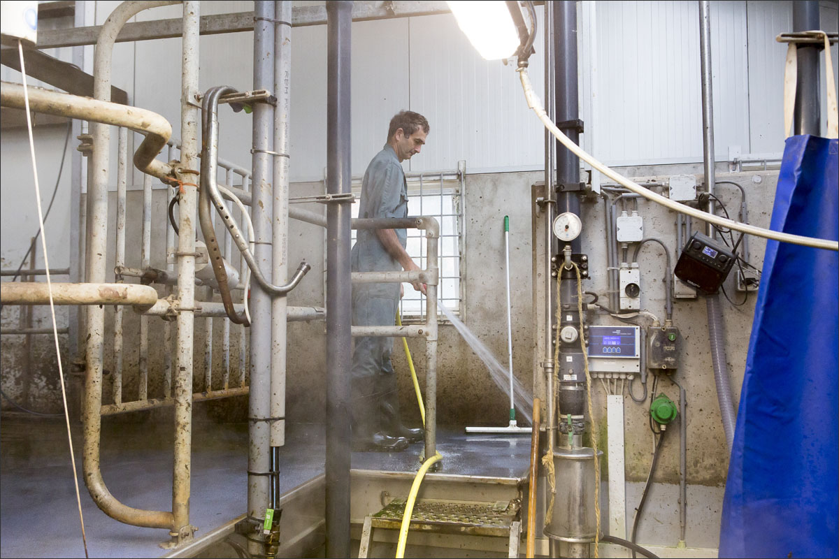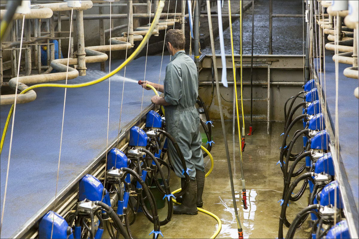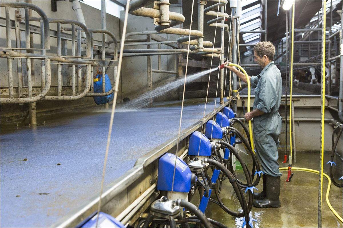 De melkstal wordt schoongemaakt en de koeien mogen na het melken weer de weide in (weidegang).