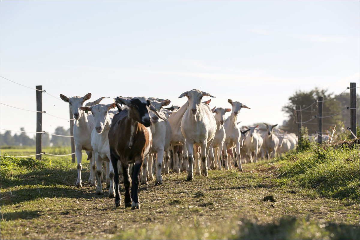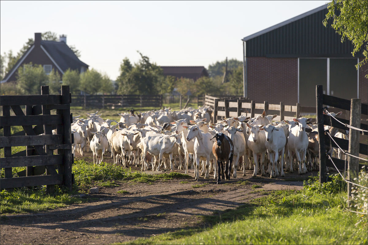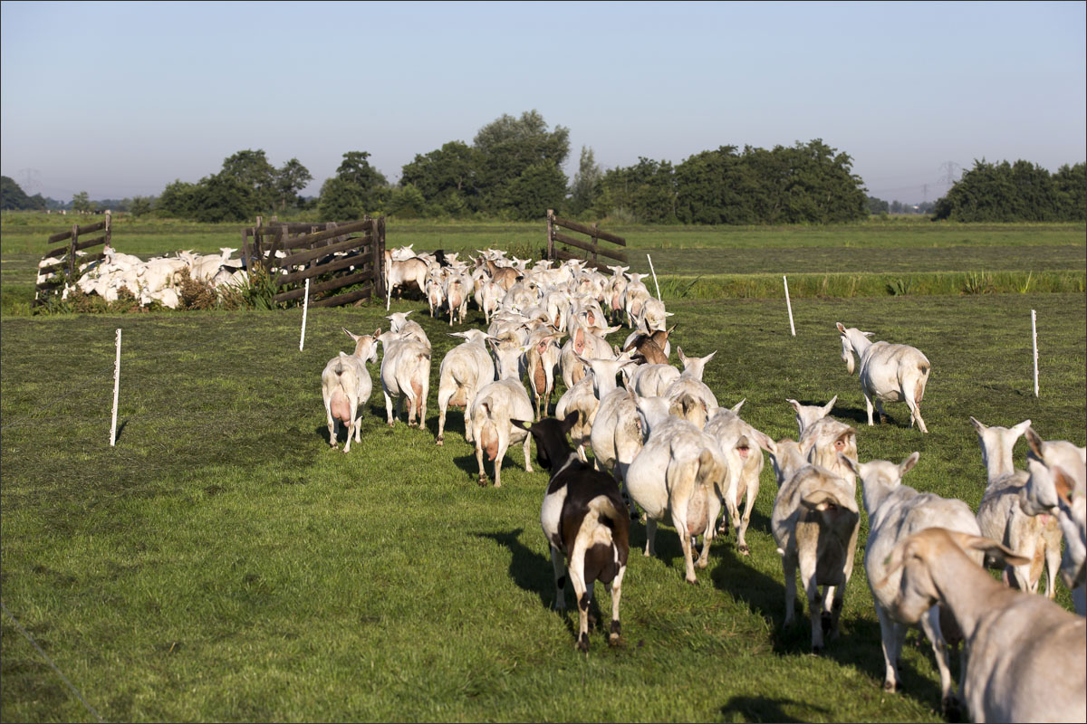 Na het melken gaan de geiten weer de weide in (weidegang).