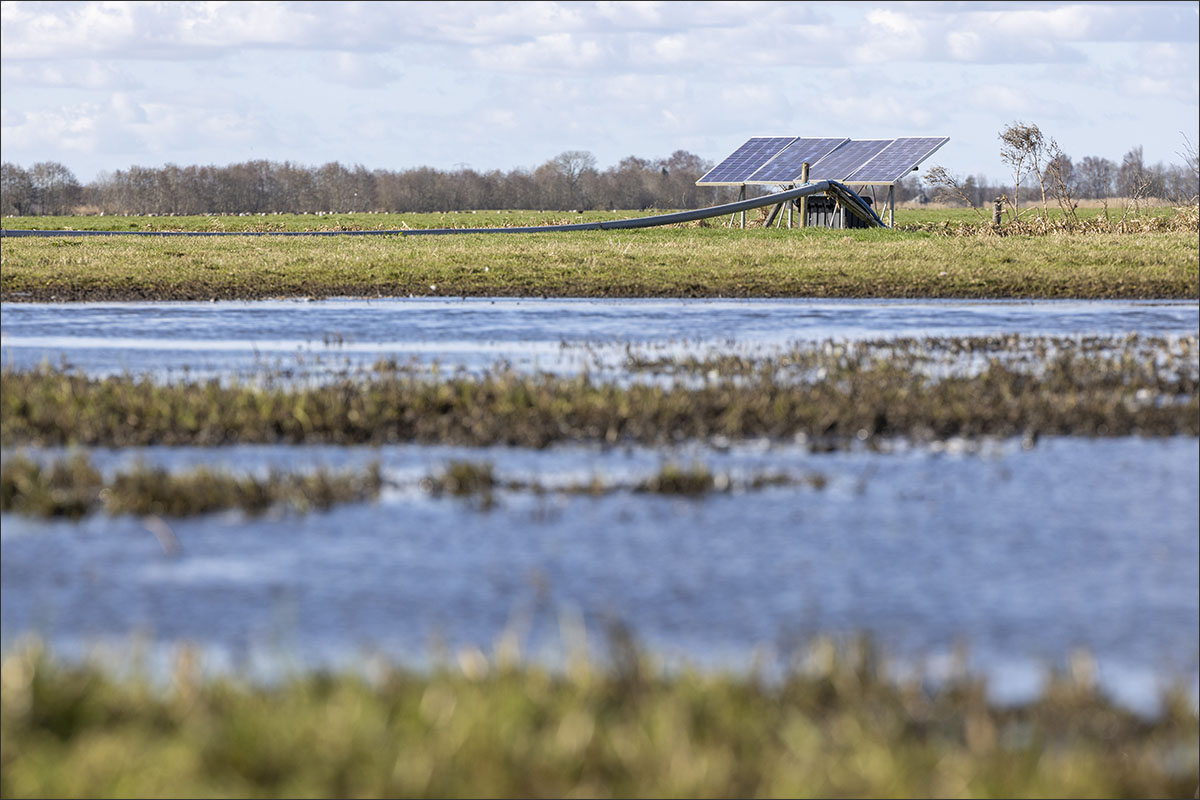 Een pomp zorgt ervoor dat het water in de plas dras terechtkomt. Deze plas dras pomp draait vaak op zonne-energie.